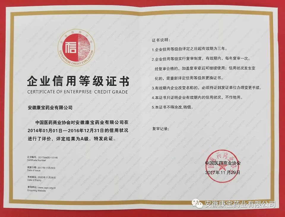 近日,中國(guó)醫(yī)藥商業(yè)協(xié)會(huì)在2017中國(guó)藥品流通行業(yè)年度大會(huì)上公布了“2017年中國(guó)企業(yè)信用等級(jí)評(píng)價(jià)”結(jié)果,最終有13家企業(yè)獲得評(píng)級(jí)認(rèn)定,安徽康寶藥業(yè)有限公司喜獲A級(jí)企業(yè)信用評(píng)級(jí)。