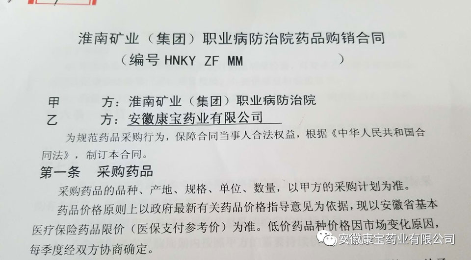 6月9日,康寶藥業與淮南礦業(集團)職業病防治院簽訂藥品購銷合同。