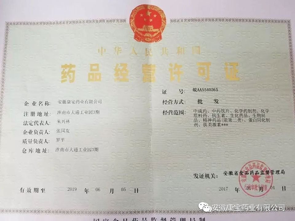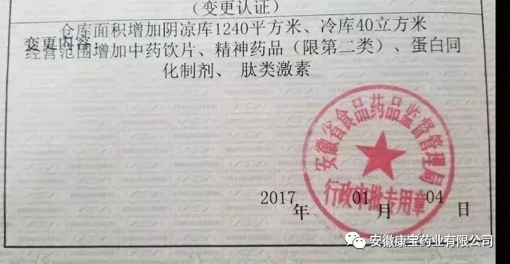 1月4日,安徽省食品藥品監督管理局正式將變更后的《藥品經營許可證》、《藥品經營質量管理規范認證證書》頒發給康寶藥業,標志著我公司順利通過“增加倉庫面積、擴大經營范圍”GSP專項認證。