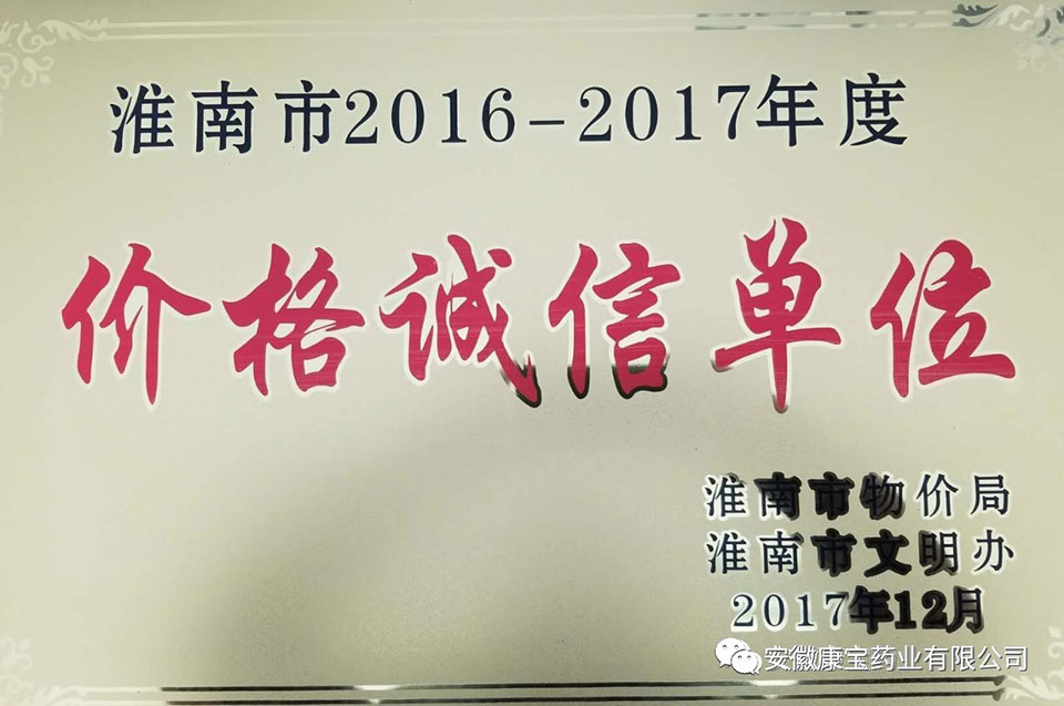 12月28日,“淮南市2016-2017年度價格誠信單位表彰大會”在金茂酒店召開,安徽康寶藥業有限公司榮獲“2016-2017年度價格誠信單位”稱號。誠信康寶,情系健康。新的一年,挑戰和機遇并存,困難與希望同在。面對保持公司事業穩步發展的重要使命,我們肩上的責任更重,我們的信心也更強。我們一定要不折不扣地按照醫院集團的總體部署,腳踏實地地強化內部管理,提高綜合素質,以飽滿的工作熱情和頑強的拼搏精神,通過我們更加科學的管理和更加精細的工作,將公司的事業全面推向前進。全力打造出公司事業更加燦爛輝煌的明天!