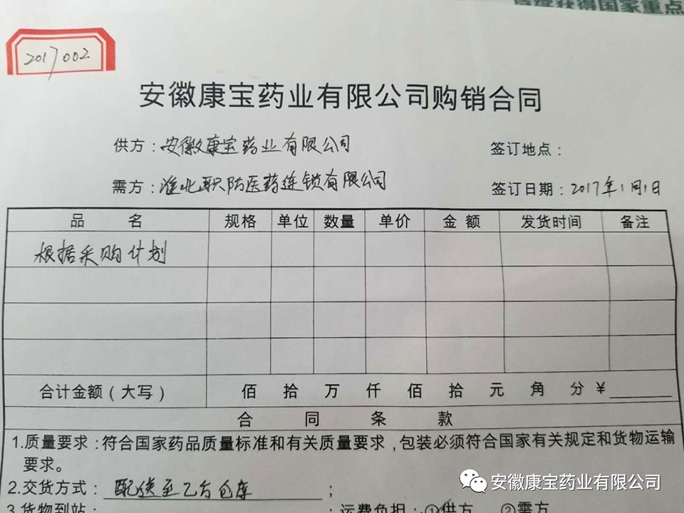 1月1日,康寶藥業與淮北職防醫藥連鎖有限公司簽訂購銷合同。