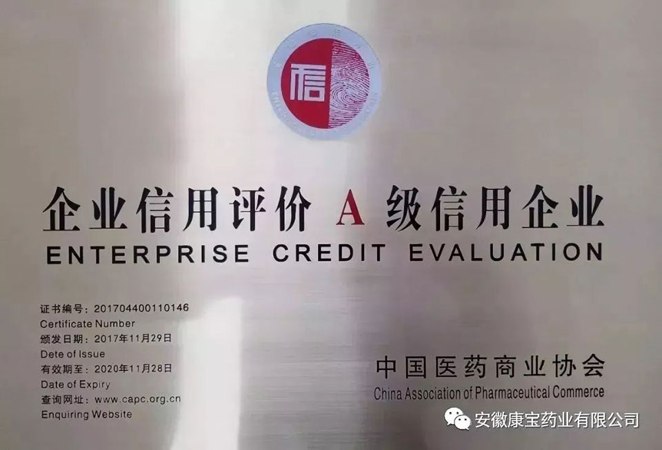 11月29日,中國醫藥商業協會在2017中國藥品流通行業年度大會上公布了“2017年中國企業信用等級評價”結果,最終有13家企業獲得評級認定,安徽康寶藥業有限公司喜獲A級企業信用評級。